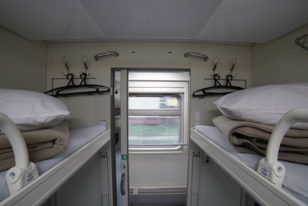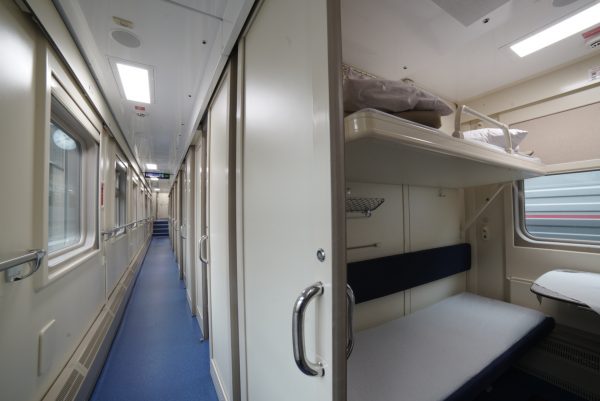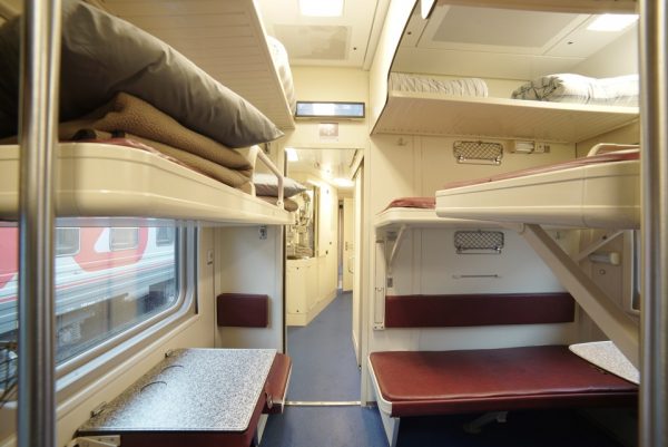В купе две нижних и две верхних полки шириной 60 см каждая. Вместимость – 4 человека.