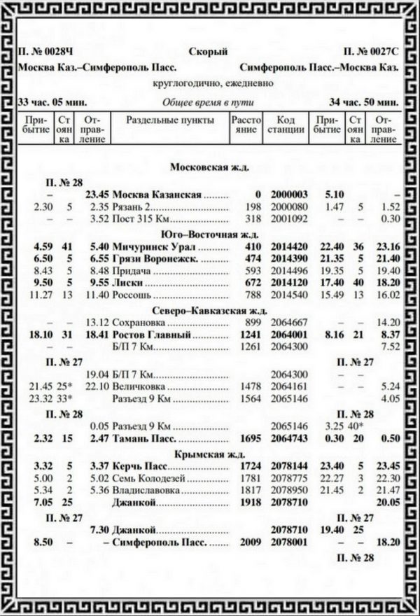 Расписание поезда №28/27 “Москва – Симферополь”/”Симферополь – Москва”
