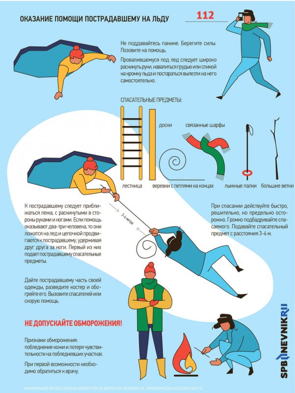 – носить при себе веревку длиной минимум 5 метров или доску, чтобы вам могли помочь в случае, если лёд полностью сломается;