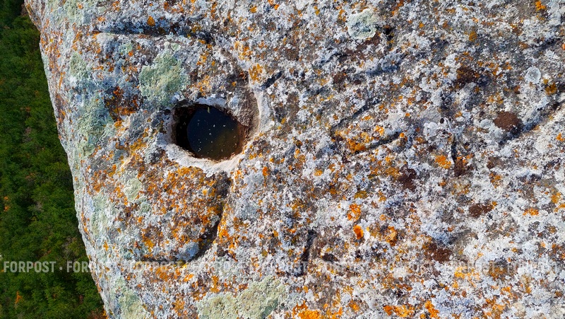 Отдышавшись после подъёма и налюбовавшись вдоволь видами, обратим внимание под ноги. Скальная поверхность мыса испещрена бороздами и лунками различного размера. Если присмотреться, то вскоре становится ясно, что это не результат работы эрозии и выветривания, а рука неизвестного мастера.
