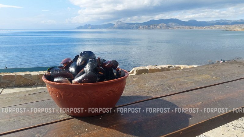 Действительно, моллюсков добавляют в кипящее масло с мелко порубленным чесноком и через пару минут уже подают на стол. Секретными ингредиентами служат свежий морской воздух и панорама Капсельской и Судакской бухт.